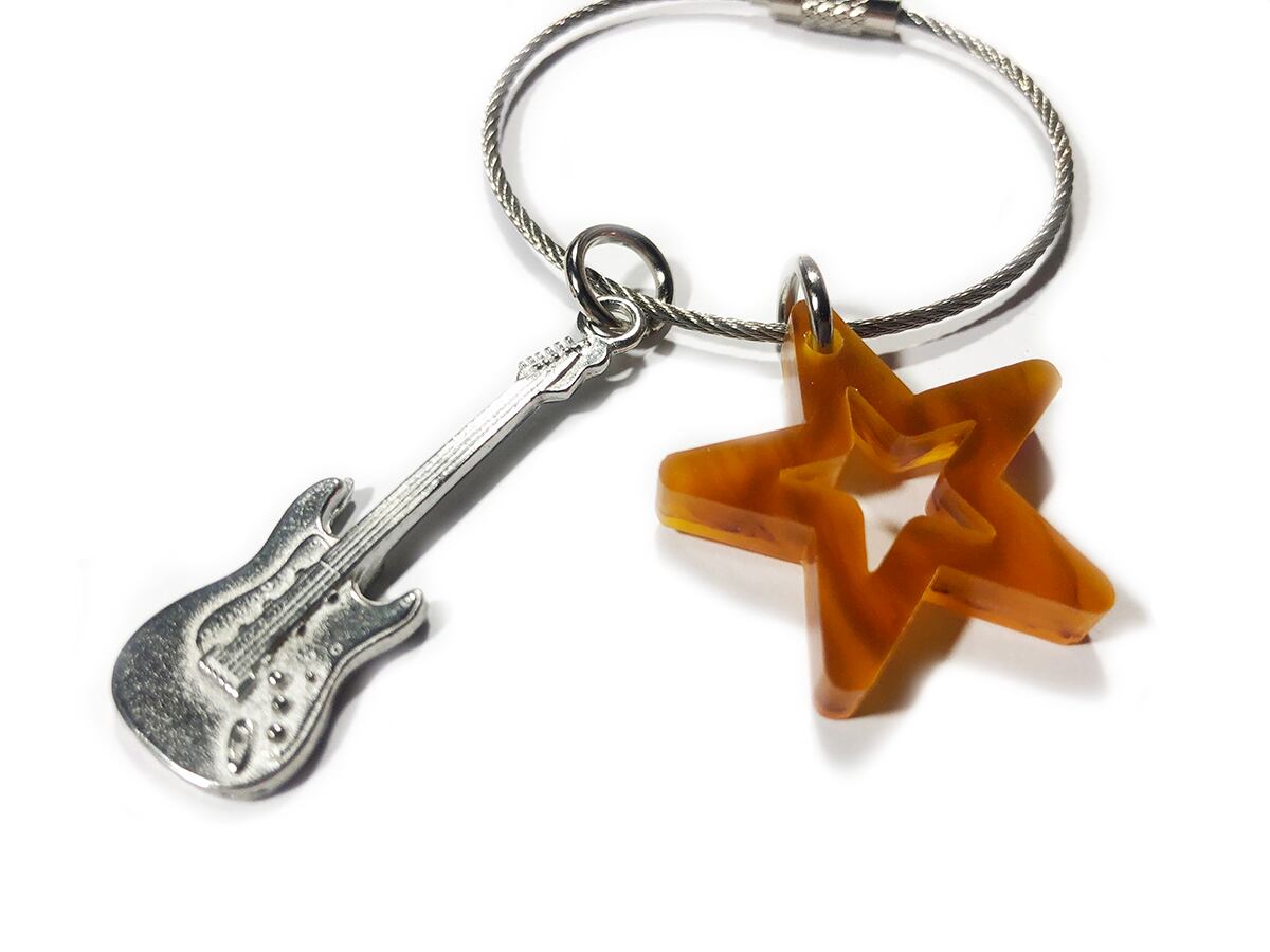 リアルなギターのチャームと星をモチーフにしたアクリルチャームの キーリング。 アクリルはハンドメイドにて作成されたデッドストック生地を使用。